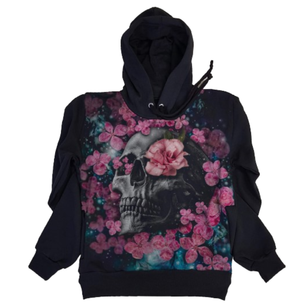 Moletom Full Print Estiloso Flanelado com Bolso e Capuz Caveira e Rosas MSB-432